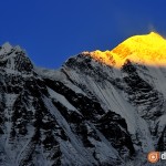 Sunlight hiting on top of Mount Dhaulagiri. At 8167m, Dhaulagiri is number 7 in the world, and the highest peak visible on the Circuit.